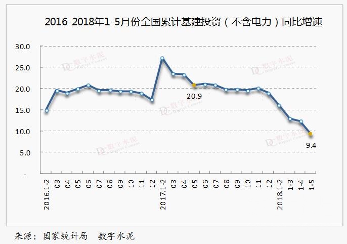 2018年1-5月份,全国基础设施投资(不含电力)同比增长9.4%,增速较1-4月份回落3个百分点,低于去年同期11.5个百分点。其中,水利管理业投资增长3.9%,增速较1-4月份回落1.9个百分点;道路运输业投资增长14.8%,增速较1-4月份回落3.4个百分点;铁路运输业投资下降11.4%,降幅较1-4月份扩大2.5个百分点。
